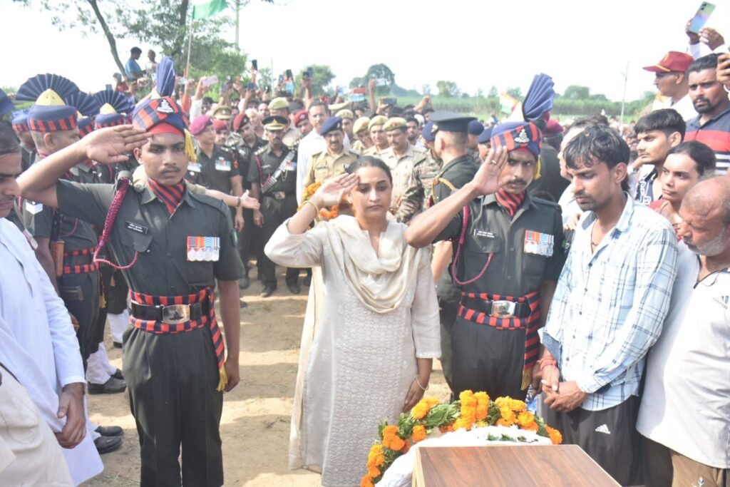 ➡️जहांगीराबाद से विशाल तिरंगा यात्रा के साथ गांव लाया गया पार्थिव शरीर, अंतिम दर्शन के लिए उमड़ी हजारों लोगों की भीड़। भारत माता की जय, जब तक सूरज-चांद रहेगा प्रभात तेरा नाम रहेगा जैसे गूंजे नारे। जिलाधिकारी श्रुति व एसएसपी दिनेश कुमार सिंह ने पुष्पचक्र अर्पित कर दी श्रद्धांजलि, सेना के अधिकारियों व परिजनों ने भी श्रद्धासुमन किए अर्पित। तिरंगे को सम्मानपूर्वक पिता को सौंपा गया। शहीद को सैन्य सम्मान, मिलिट्री बैंड और गार्ड ऑफ ऑनर के साथ दी गई अंतिम विदाई।