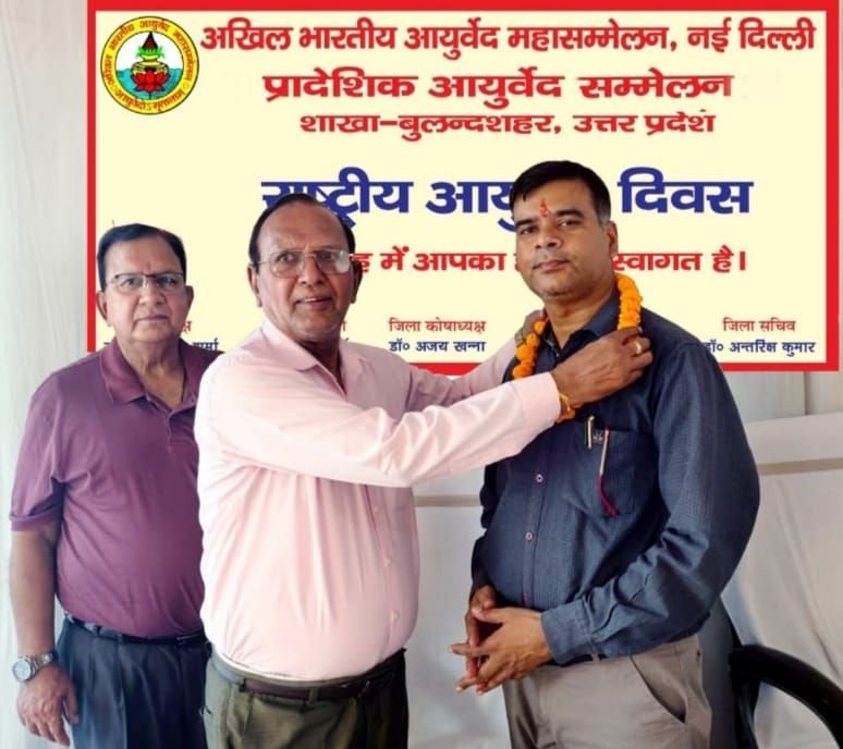 📰✍️राष्ट्रीय आयुर्वेद दिवस का आयोजन; अखिल भारतीय आयुर्वेद महासम्मेलन एवं क्षेत्रीय आयुर्वेद कार्यालय के संयुक्त तत्वाधान में राष्ट्रीय आयुर्वेद दिवस का आयोजन किया गया। कार्यक्रम में जनपद बुलंदशहर इकाई के जिलाध्यक्ष डॉ. शिवकुमार शर्मा, जिला महामंत्री डॉ. सतीश गर्ग, डाक्टर अंतरिक्ष जिला सचिव, जिला कोषाध्यक्ष डॉ. अजय खन्ना और पूर्व क्षेत्रीय अधिकारी डॉ. अशोक शर्मा एवं तहसीलों से आए आयुर्वेद चिकित्सक उपस्थित रहे।
