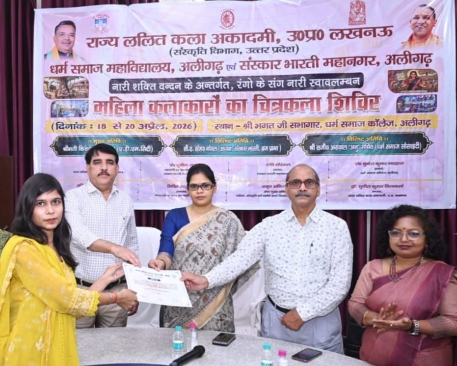 📰✍️अलीगढ़ में नारी स्वावलंबन शिविर का समापन, महिलाओं की क्षमता पर जोर, बुलंदशहर की महिला कलाकारों ने भी लिया भाग; राज्य ललित कला अकादमी ने कराया आयोजन, समापन में एडीएम सिटी किंशुक श्रीवास्तव ने महिलाओं की क्षमता पर जोर दिया, प्राचार्य मुकेश भारद्वाज ने स्त्री सशक्तीकरण को बताया जरूरी, शिविर में कलाकारों ने अपनी कलाकृतियों के माध्यम से नारी संघर्ष, जागरुकता और सशक्तीकरण का प्रस्तुत किया संदेश। इनमें शिवानी सिंह, डॉ. दिशा झा, पूनम, डॉ. ममता बंसल, डॉ. एकता श्रीवास्तव, रश्मि सिंह, डॉ. चंद्रावती, डॉ. सुभा जैन, शशि चौधरी, डॉ. अनु महाजन, डॉ. स्वाति गुप्ता, बुलंदशहर से साक्षी राघव, डॉ. रेनू यादव, डॉ. पूनम रानी और डॉ. शुभ्रा शामिल रहीं।
