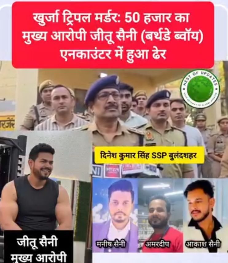 2.📰✍️ खुर्जा ट्रिपल मर्डर केस का मुख्य आरोपी 50 हजार का इनामी ‘बर्थडे बॉय’ जीतू सैनी पुलिस के साथ मुठभेड़ में ढेर, स्वाट टीम प्रभारी इंस्पेक्टर मोहम्मद असलम सहित दो पुलिसकर्मी भी घायल; क्षेत्र के सुभाष रोड स्थित जिम में 25 अप्रैल को बर्थडे पार्टी में केक लगाने के विवाद पर पिस्टल से भाजपा नेता के परिवार के आकाश, मनीष व अमनदीप की हत्या करने वाला इनामी जीतू सैनी तड़के ढाकर रोड पर पुलिस मुठभेड़ में मारा गया, फायरिंग में एसओजी प्रभारी असलम व एक सिपाही घायल, उसके साथ मौजूद एक साथी फरार होने में रहा कामयाब, मामले में कुल पांच आरोपी अभी भी फरार जीतू सैनी के एनकाउंटर से मृतक अमरदीप की बहन व पत्नी खुश, सीएम योगी का किया धन्यवाद।