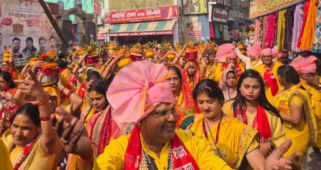 3.📰✍️ सिटी के सर्राफा बाजार स्थित ठाकुरद्वारा मंदिर में 16 नवंबर तक श्रीमद् भागवत का होगा आयोजन, इससे पहले आज भव्य कलश यात्रा का धूमधाम से हुआ आयोजन, सिर पर कलश धारण कर यात्रा में शामिल हुई सैकड़ो महिलाएं।
