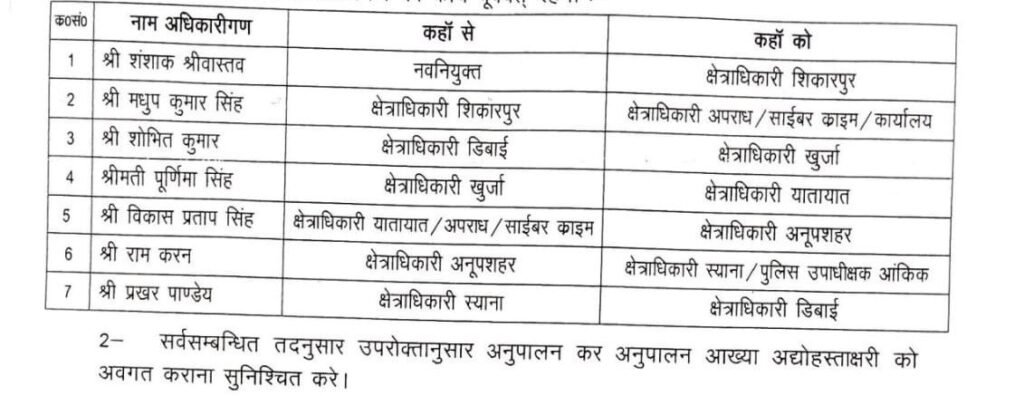 ➡️सीओ अनूपशहर रामकरण सिंह को बनाया सीओ स्याना, वहीं शासन से आए शशांक श्रीवास्तव को बनाया सीओ शिकारपुर, शिकारपुर सीओ मधुप सिंह अब संभालेंगे सीओ साइबर क्राइम इंचार्ज का चार्ज। सीओ डिबाई शोभित कुमार को सीओ खुर्जा, सीओ खुर्जा पूर्णिमा सिंह को सीओ ट्रैफिक की दी गई है जिम्मेदारी। सीओ ट्रैफिक विकास प्रताप सिंह को सीओ अनूपशहर, स्याना सीओ प्रखर पांडेय को सीओ डिबाई किया नियुक्त।